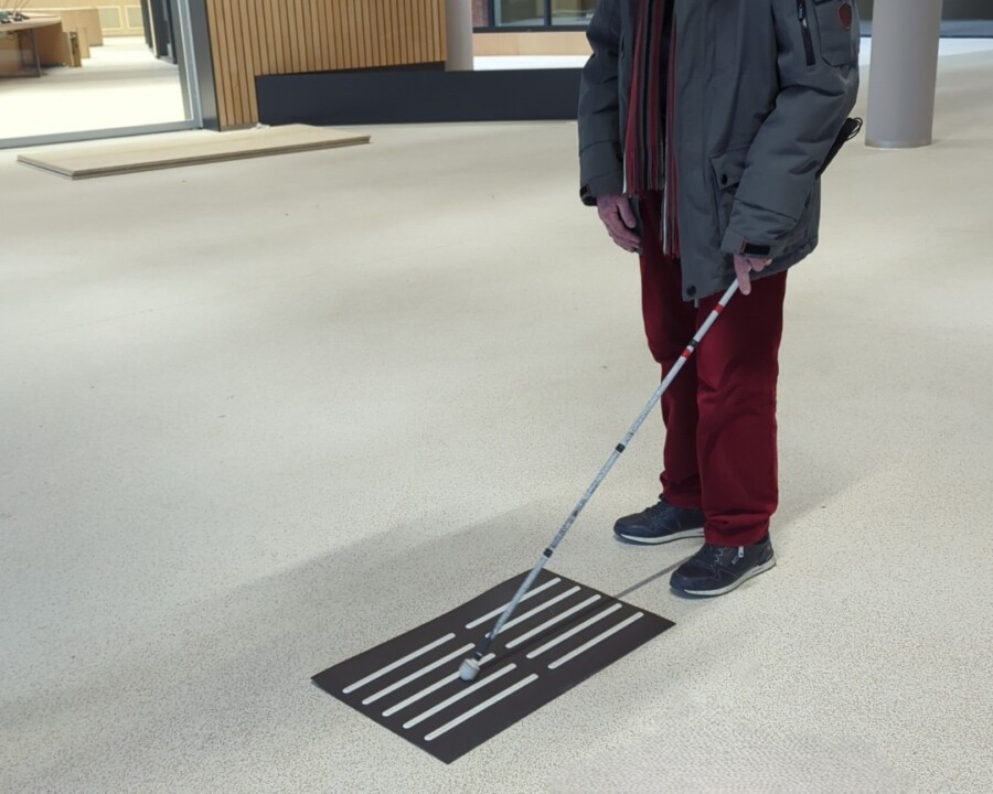 Qua uitvoering is er gekozen voor ribbels van Blinkink, zodat de route aanpasbaar is mocht er toch nog iets veranderen. De voelbaarheid is met ervaringsdeskundigen van het Platform getest, en de contrastkleur is uitgekozen op de al bestaande vloer.