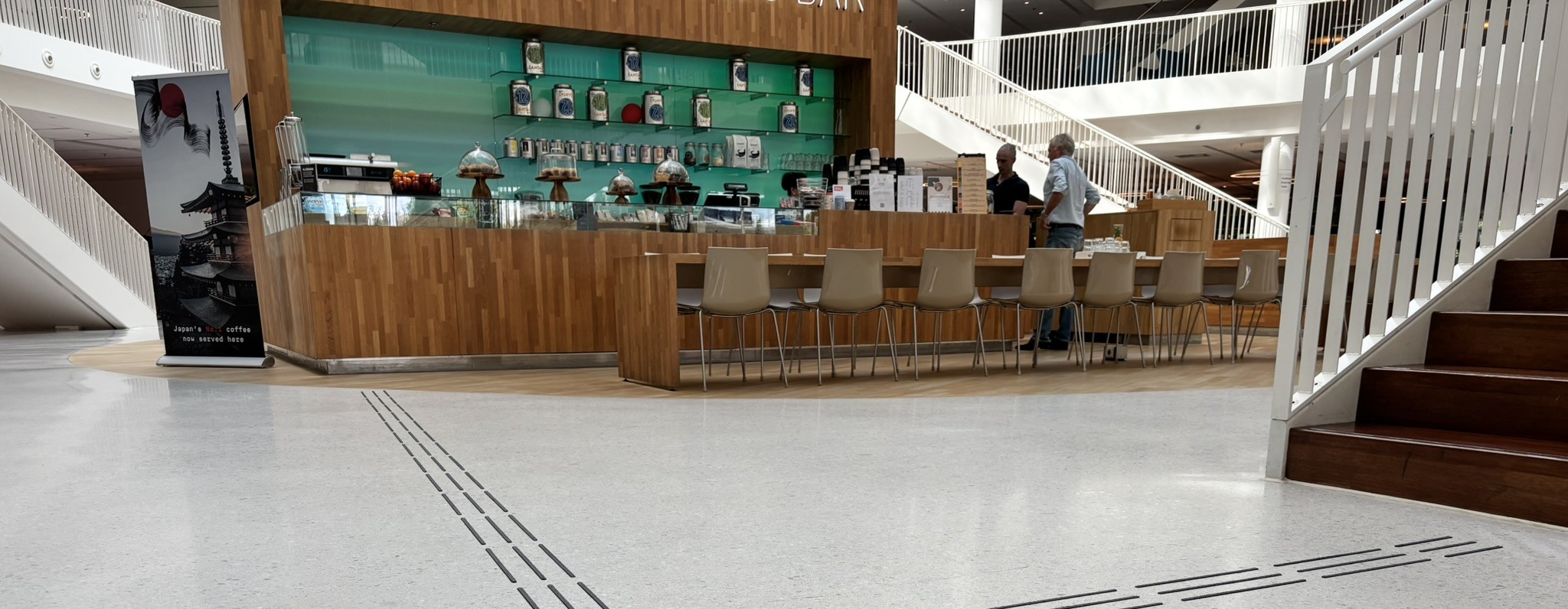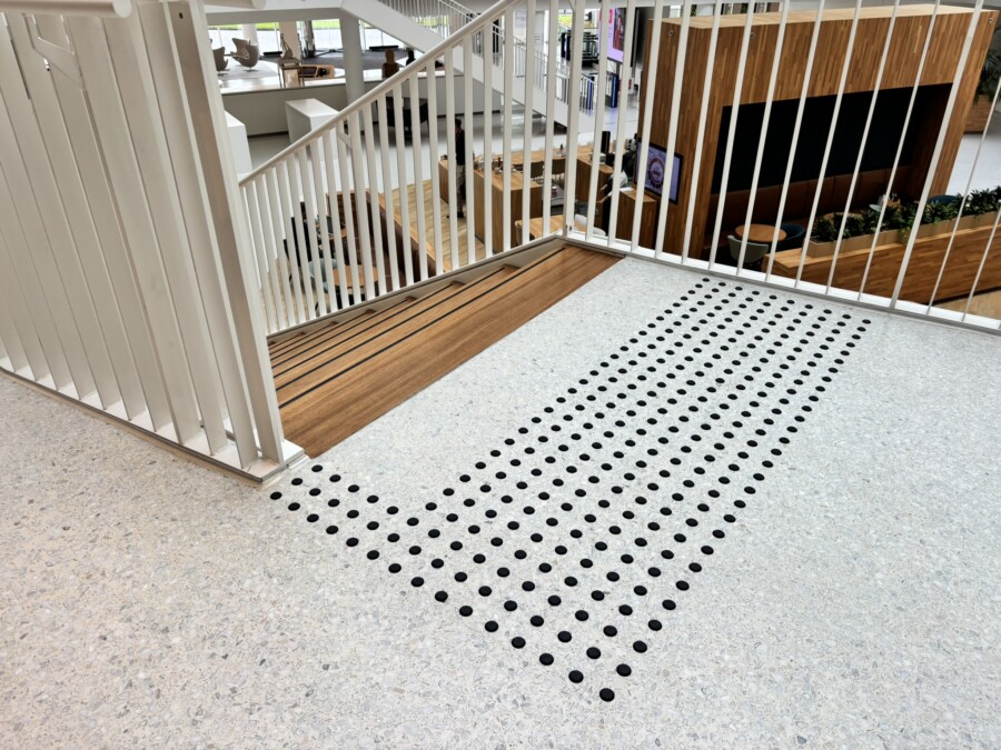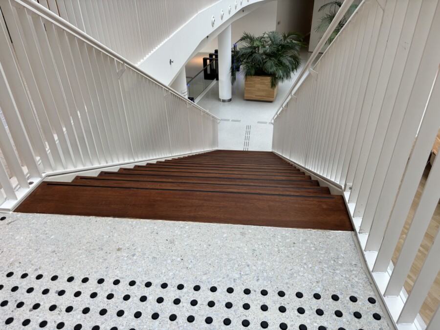 De route begint bij de ingang van het Eneco-terrein en loopt via deels natuurlijke gidslijnen naar het gebouw en vervolgens naar belangrijke punten zoals de ontvangstbalie, liften, Espressobar en de IT- en Hospitality servicebalie. Alle open trappen – binnen én buiten – zijn voorzien van waarschuwingsmarkeringen, zodat het trapgat tijdig en duidelijk wordt aangegeven.