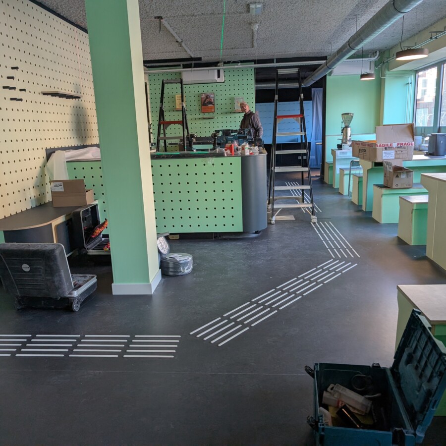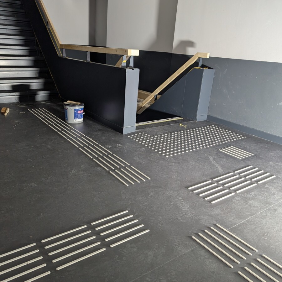 Product: Blinkink geleideroute (geleidelijnen en noppen) en Blinkink aluminium trapmarkeringen