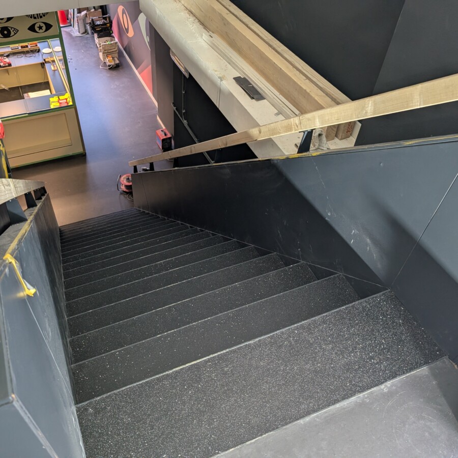Alle trappen zijn voorzien van diffuus contrasterende trapmarkeringen van behandeld en gematteerd aluminium. Snel geplaatst, direct na aanleg te belopen.