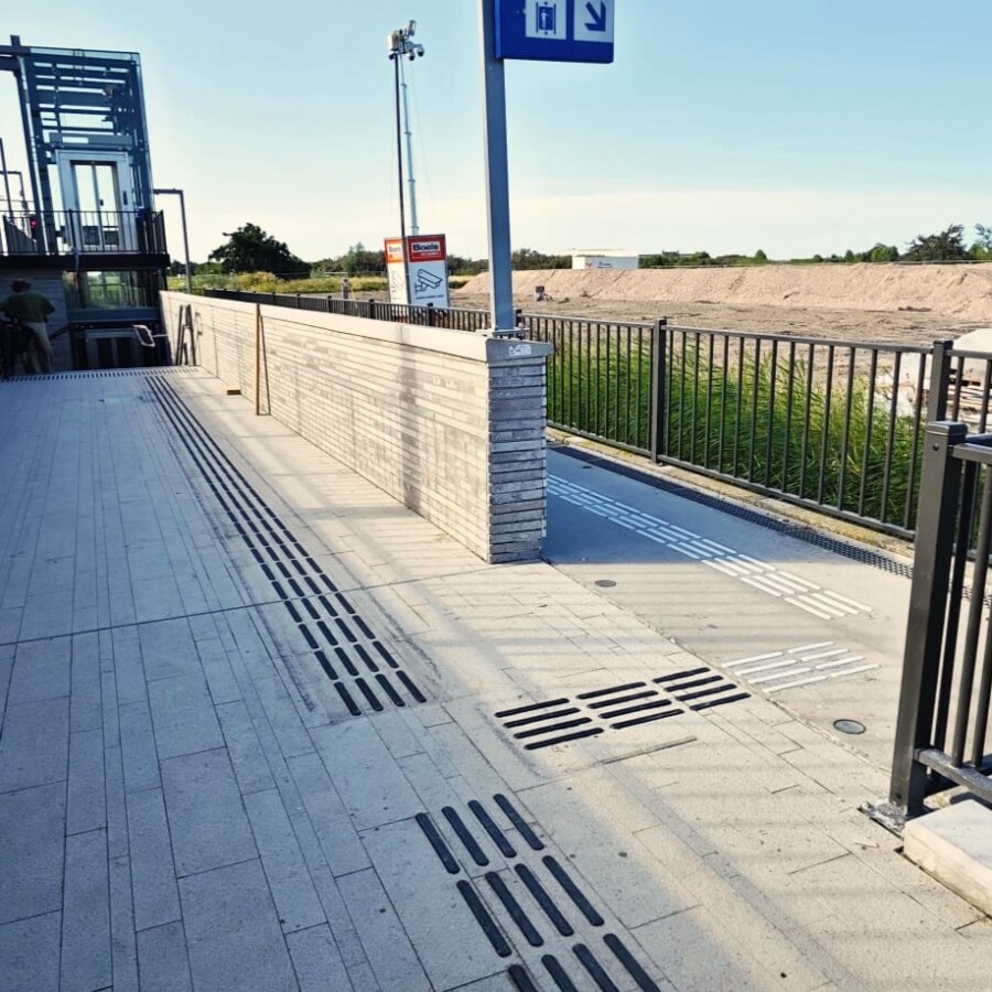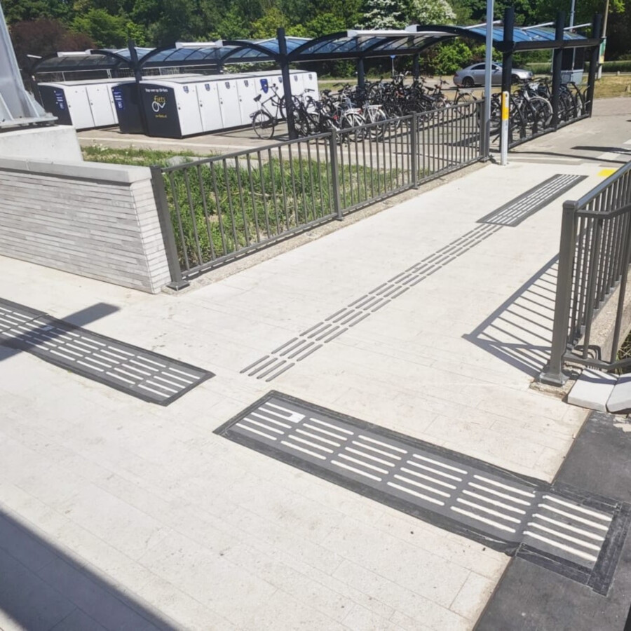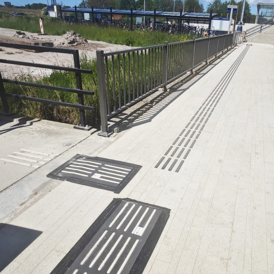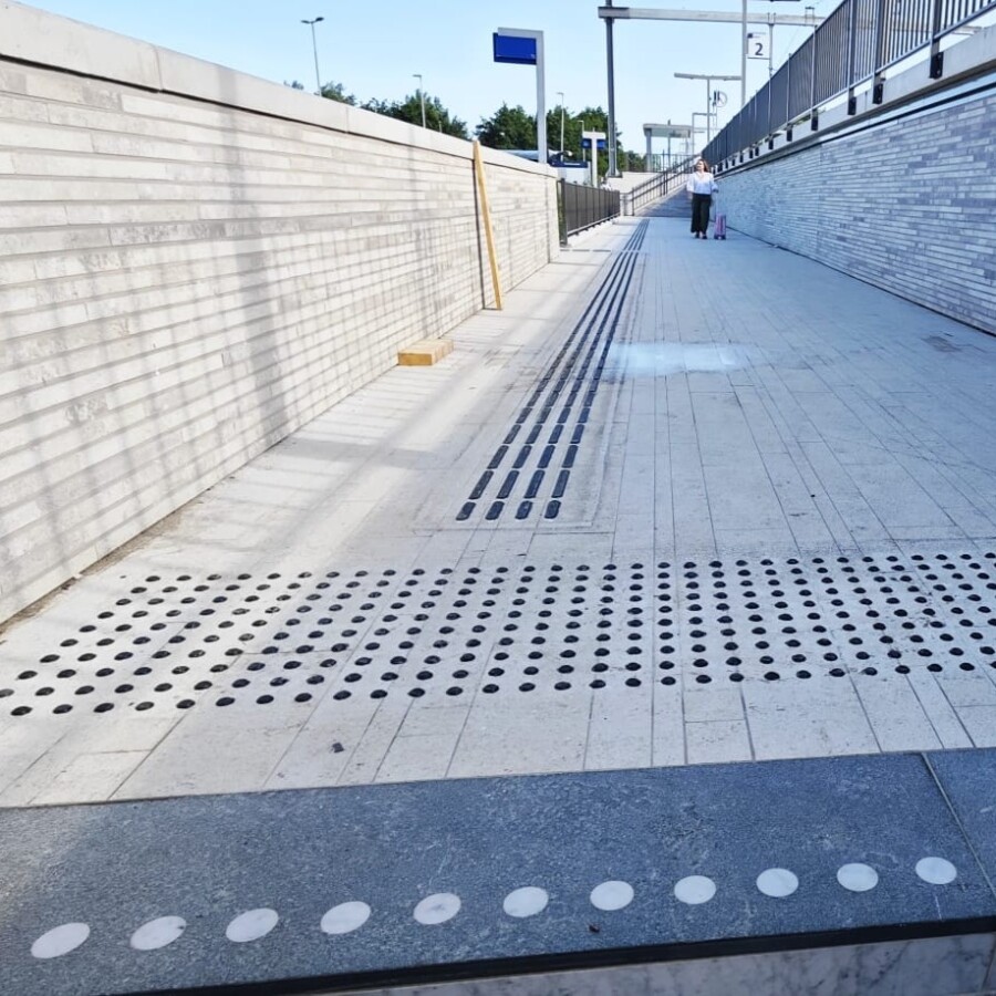 TG Lining heeft in meerdere fases gewerkt aan de geleideroute voor Station Den Helder Zuid. In totaal zijn is er zo’n 750 meter aan epoxyhars geleidelijnen aangelegd en de epoxynoppen die als waarschuwingsmarkeringen bovenaan de trappen en als eindemarkering op de perrons toegepast zijn. De CiCo-zuil is voorzien van een gele objectmarkering.