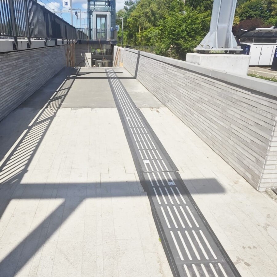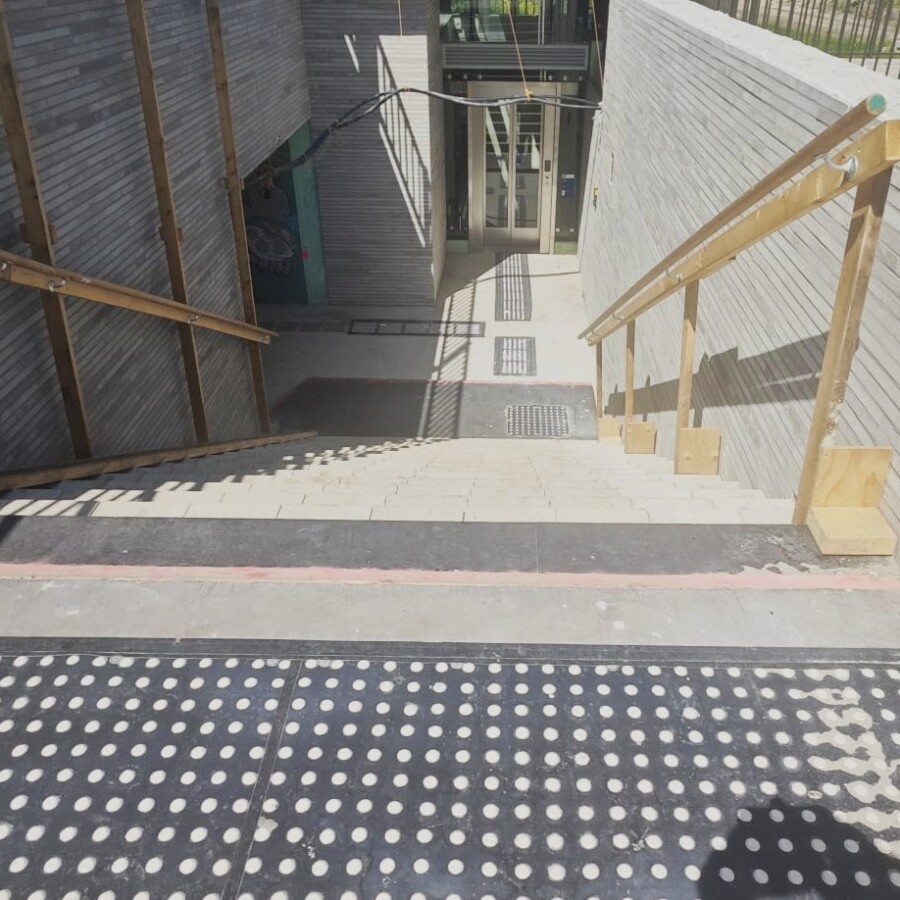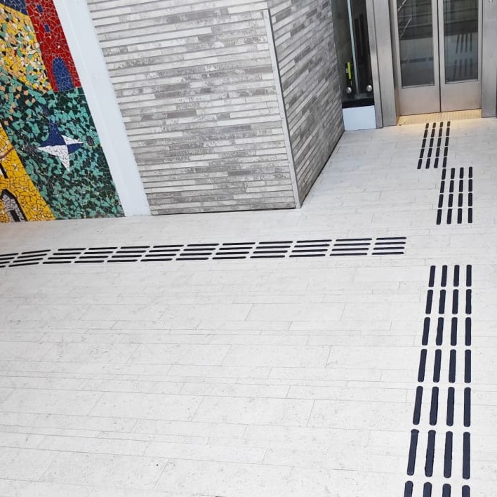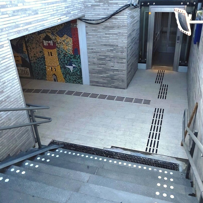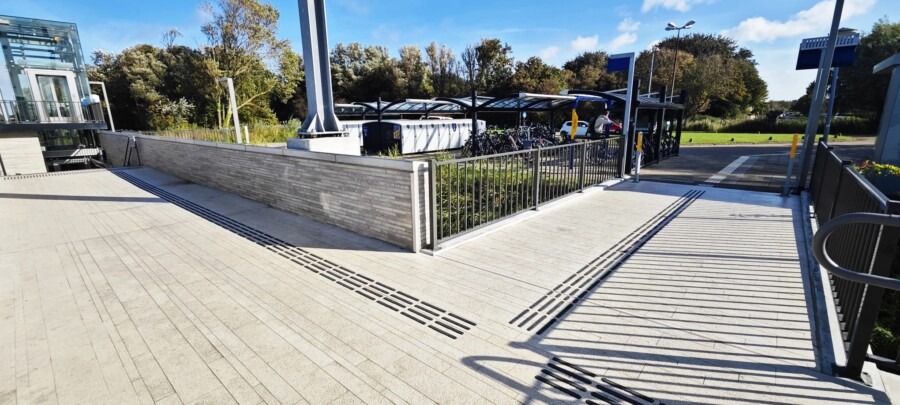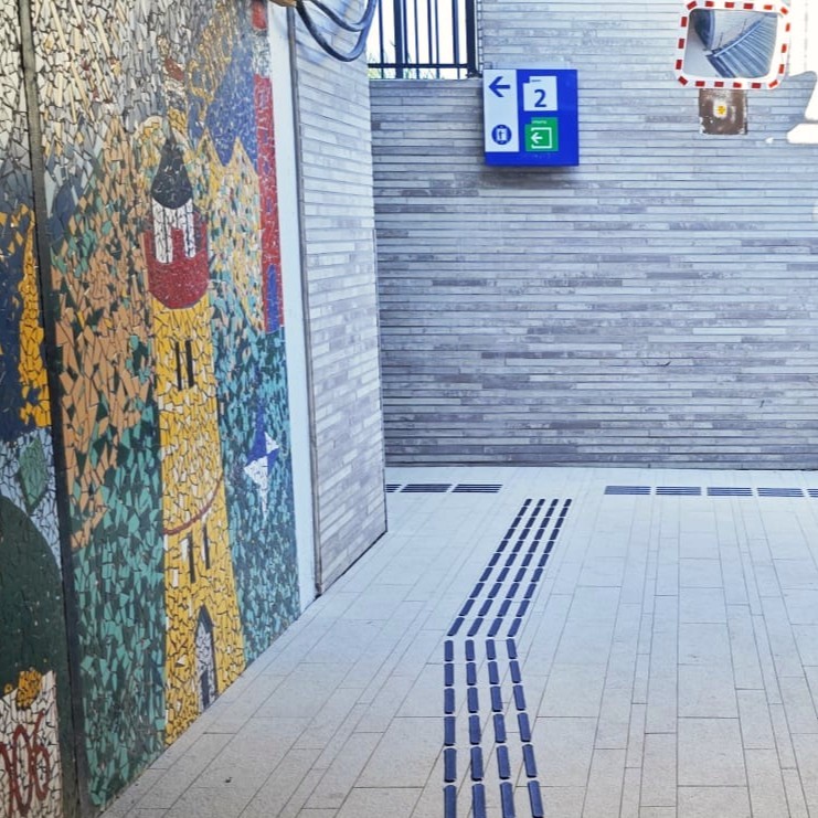 TG Lining heeft in meerdere fases gewerkt aan de geleideroute voor Station Den Helder Zuid. In totaal zijn is er zo’n 750 meter aan epoxyhars geleidelijnen aangelegd en de epoxynoppen die als waarschuwingsmarkeringen bovenaan de trappen en als eindemarkering op de perrons toegepast zijn. De CiCo-zuil is voorzien van een gele objectmarkering.