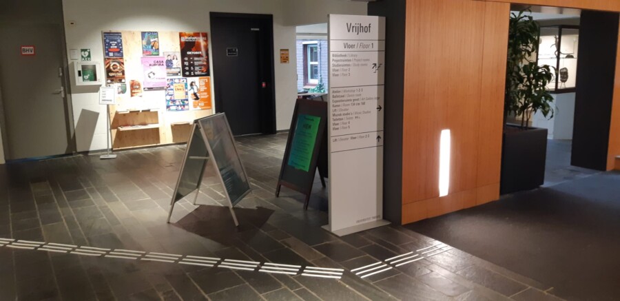 In de Vrijhof zijn er voor een medewerker met een visuele beperking geleidelijnen vanaf de entree op en naar de servicedesk op de eerste verdieping geplaatst. Bovenaan de trap is een waarschuwingsmarkering (bestaande uit noppen) aangelegd. Het resultaat is een minimale route, waarbij verder gebruikt wordt gemaakt van natuurlijke gidslijnen en gewenning van het gebouw.