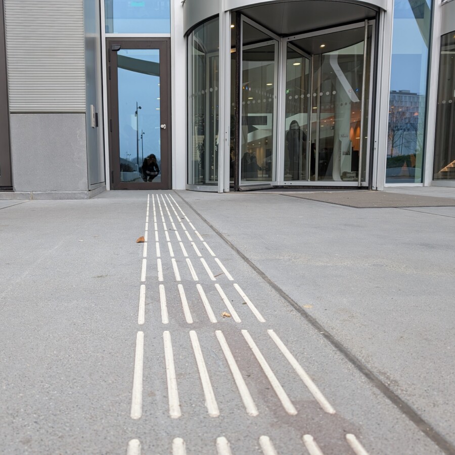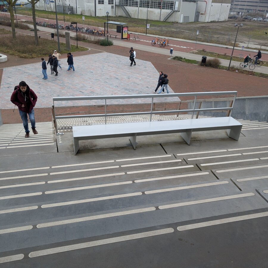 Op locatie heeft TG Lining vervolgens op de bestaande betonnen ondergrond de epoxyhars geleidelijnen aangelegd, aansluitend op de ribbelklinkers en leidt de route naar de ingang van de Universiteit. De tribunetrap is voorzien van trapmarkeringen.