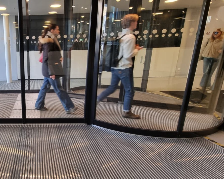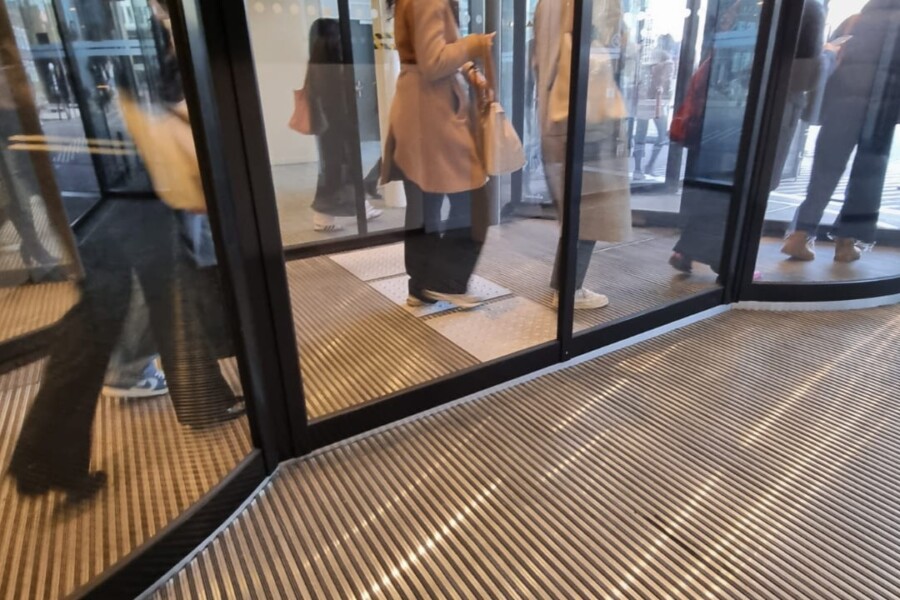 Op de vloer van de dubbele draaideur zijn aluminium klankplaten met een noppenstramien bevestigd ter aanduiding van een veilige ruimte tussen de draaiende elementen.