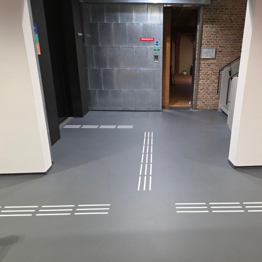 Vanaf de entree is er een route van geleidelijnen naar de receptie en de gastvrouw. Vervolgens zijn er geleidelijnen naar de liften en een overlap naar de natuurlijke gidslijnen gecreëerd. De lift is door een opvangstrook altijd weer terug te vinden.