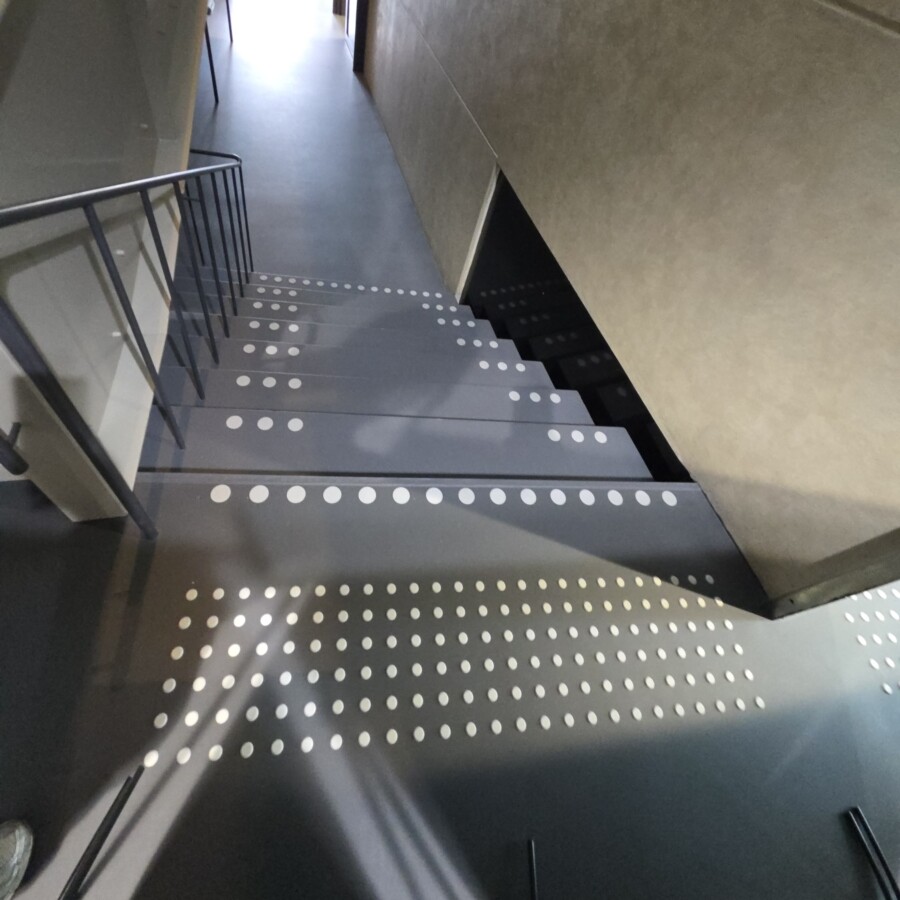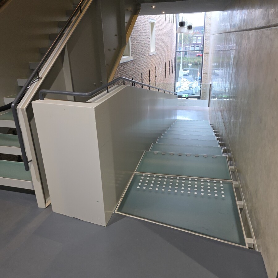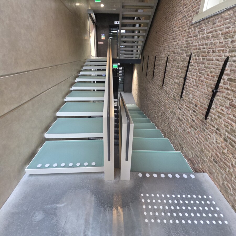 Alle trappen zijn voorzien van diffuus contrasterende trapmarkeringen van behandeld en gematteerd aluminium.