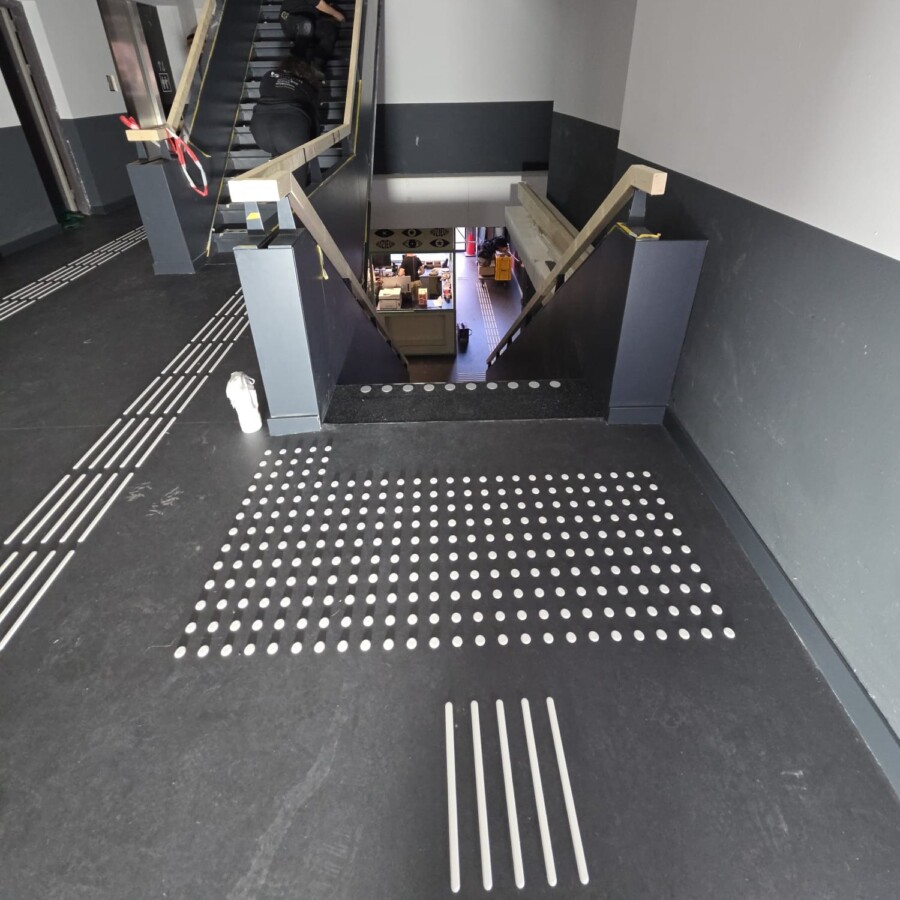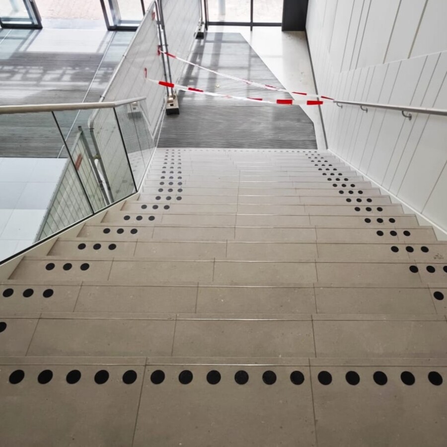 Op de video is naast een stipmarkering op de trap, ook een tijdelijke geleideroute zichtbaar van Blinkink-matten.