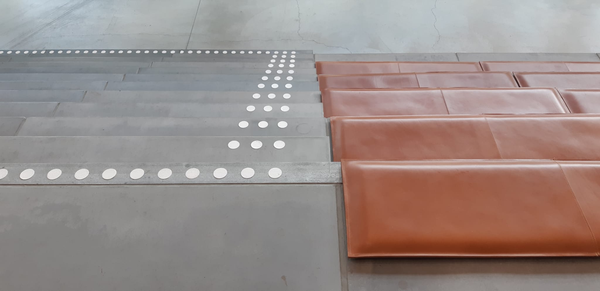 De diffuus contrasterende trapmarkeringen kunnen worden uitgevoerd in messing of in behandeld en gematteerd aluminium. Snel geplaatst, direct na aanleg te belopen.